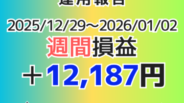週間実績 【週間実績】年末年始もプラス収支!2025年12月29日~2026年1月2日のEA運用結果(お年玉ゲット!) あけましておめでとうございます! モグにゃんです。2026年がスタートしましたね。本年もどうぞよろしくお願いいたします!さて、今回は 2025年の年末から2026年の年始にかけて(12/29~1/2) の運用実績報告です。ご存知の通り、年末... 2026.01.04 週間実績運用実績