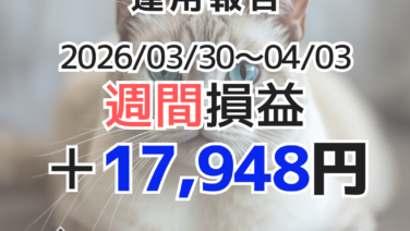 運用実績 【祝日も爆益】ほったらかしで週給7万円!+70,490円のEA運用実績(3/16〜3/20) こんにちは! モグにゃんです。3月もいよいよ後半戦ですね!今週の金曜日(3/20)は「春分の日」で祝日でしたが、みなさんはゆっくり休めましたか?お墓参りに行かれた方や、3連休で少し遠出をしてリフレッシュされた方も多いかもしれませんね。実は、... 2026.03.22 週間実績運用実績