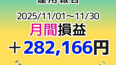 月間実績 【月間実績】2025年11月のEA運用結果!荒れ相場も完全攻略で28万円の利益 こんにちは、モグにゃんです。2025年11月(11月1日~11月30日)の月間運用実績を公開します。先月に続き、11月も安定して大きな利益を出すことができました。 11月の収支結果期間 : 2025/11/01 ~ 2025/11/30通貨... 2025.12.23 月間実績
