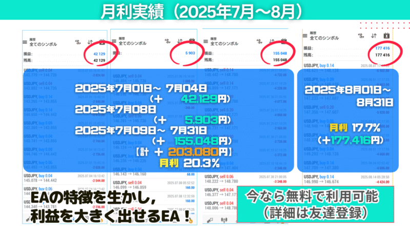 予測不能な急変動には対応が難しい場合もあるため、リスク管理が重要です。 とはいえ、これはどのEAにも共通する課題といえます。